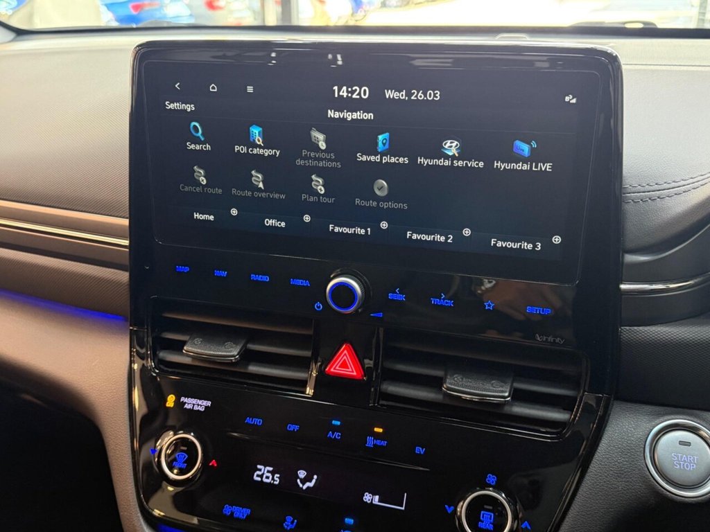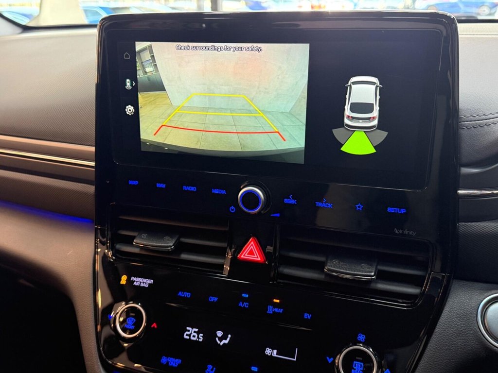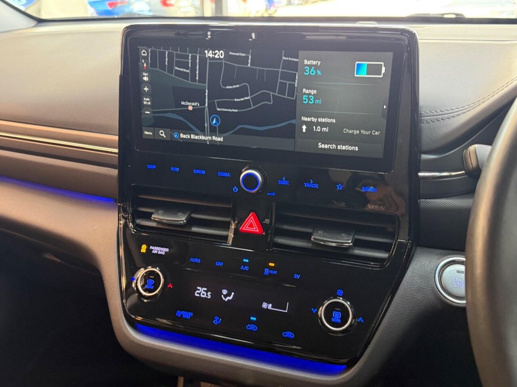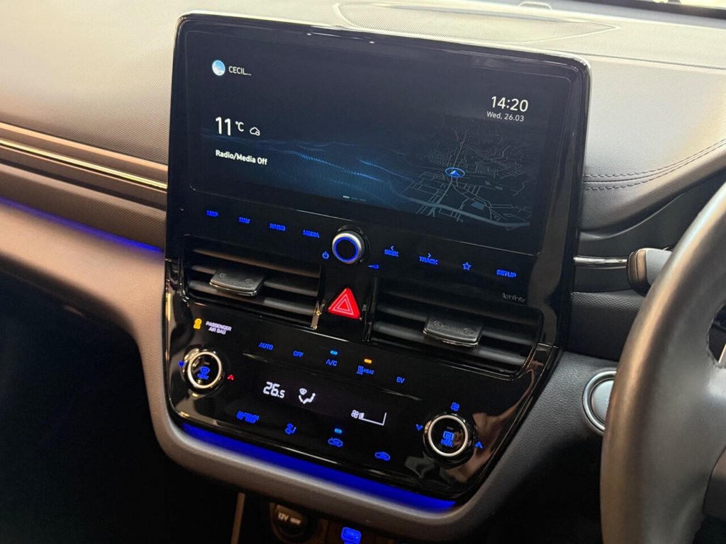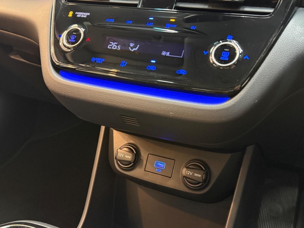 This is a Hyundai IONIQ Premium, a fully electric car registered in 2022. It comes in the Premium trim and boasts very low mileage of only 16,300 miles. The vehicle is equipped with a wireless phone charging pad, ensuring your devices stay powered on the go. Enjoy an immersive audio experience with its upgraded Infinity sound system, featuring a centre speaker, tweeters, front and rear speakers, a subwoofer, and an external amplifier. The dual-zone climate control provides optimal comfort for both the driver and passengers, while heated driver's seat adds a touch of luxury. Rear parking sensors make maneuvering simple. With a total battery capacity of 43 kWh, this IONIQ offers a maximum range of 193 miles when new. Charging at home using a 7kW charger takes approximately 6 hours and 5 minutes. For those needing a quicker charge, the IONIQ can be charged from empty to 80% in just 54 minutes at the fastest public charging points. The boot space offers a practical 357 litres, making it more generous than similar vehicles and ideal for your everyday needs.